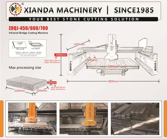इस मशीन को स्तंभों, बड़े धनुष के आकार के स्लैबों और ग्रेनाइट, संगमरमर और क्वार्ट्ज जैसी सामग्रियों में विशेष पत्थरों के आकारों को काटने के लिए डिज़ाइन किया गया है।